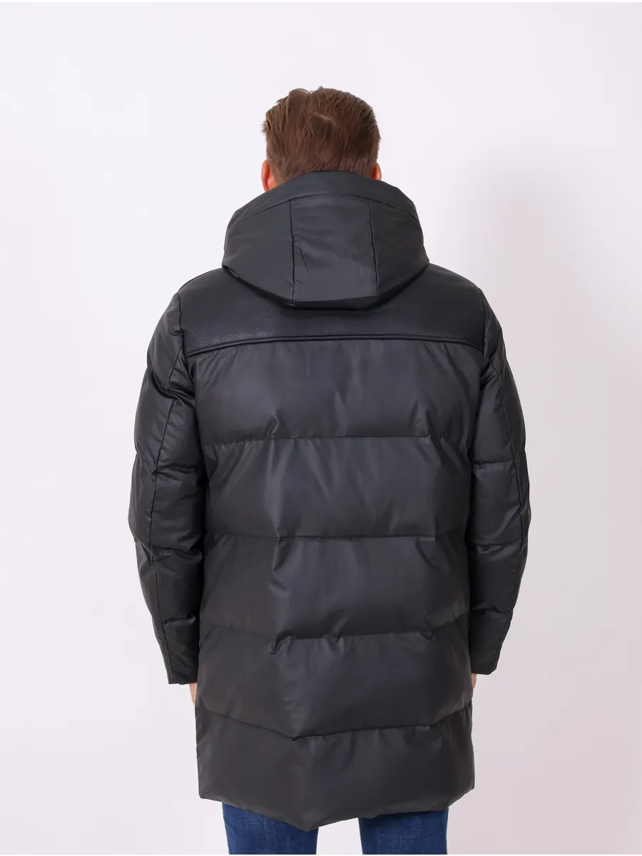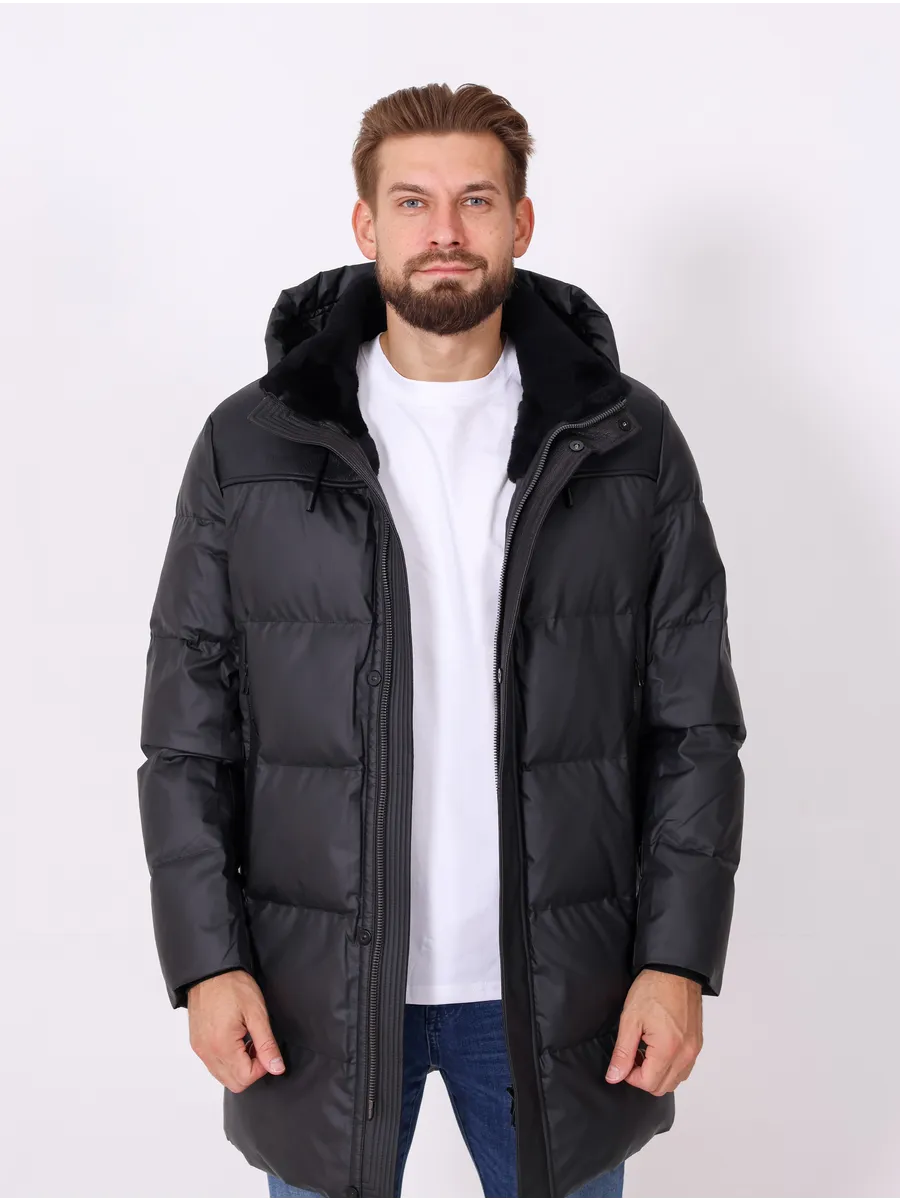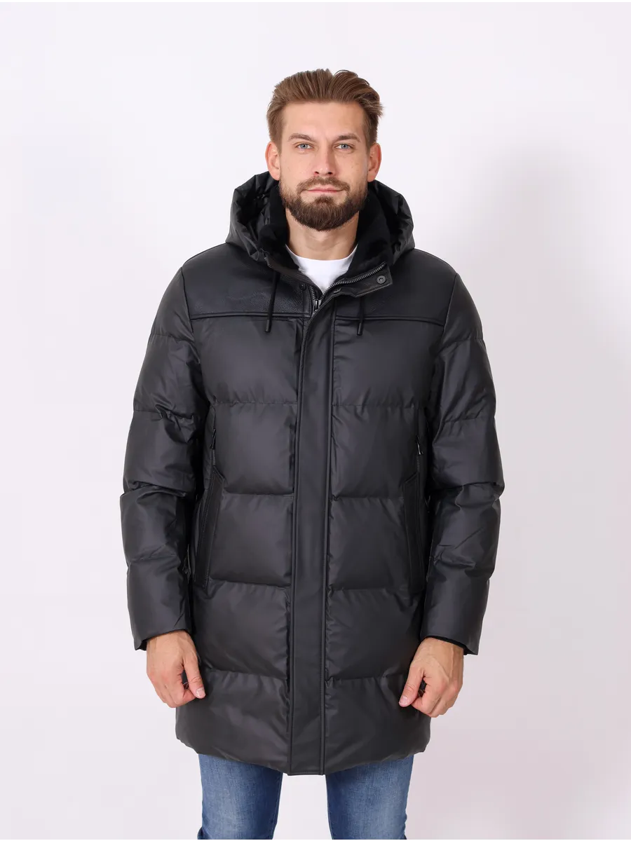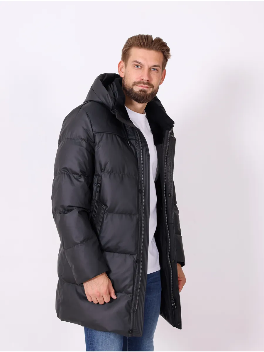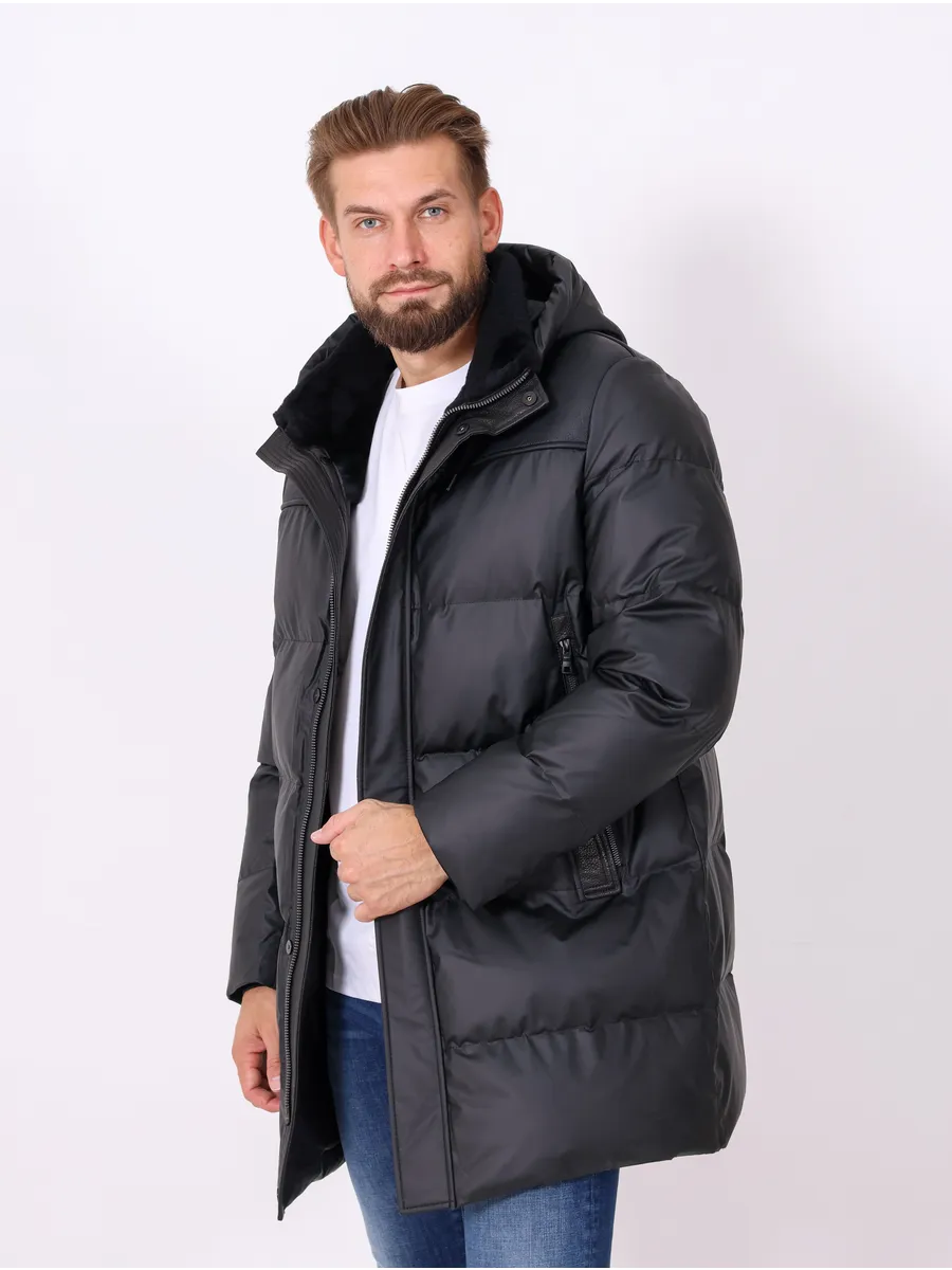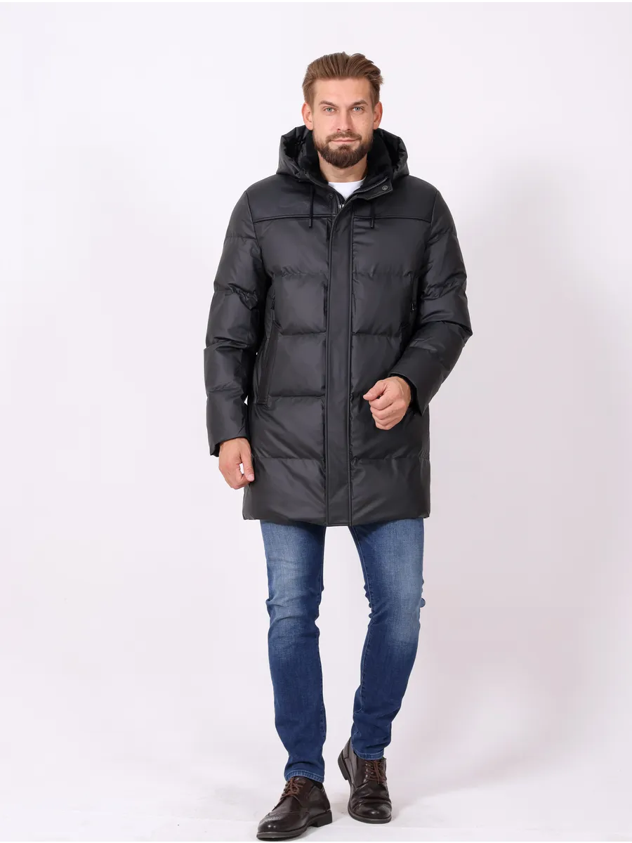 Теплая зимняя мужская куртка станет незаменимым элементом вашего гардероба в холодное время года. Куртка зимняя с капюшоном имеет стеганый дизайн, который обеспечивает равномерное распределение утеплителя, сохраняя тепло и предотвращая образование холодных зон. Стеганая мужская куртка большого размера подходит как для повседневной носки, так и для более формальных случаев. Практичность классической удлиненной куртки с капюшоном подчеркивается наличием теплого меха на воротнике, что делает этот пуховик стильным и необычным. Верхний слой теплого классического зимнего пальто изготовлен из высококачественного материала в составе которого полиэстер и отделка из натуральной кожи. Фурнитура premium черного цвета на карманах и по всей длине. Наполнитель теплой куртки - био пух. Этот материал эффективно удерживает тепло. Люксовая куртка с меховым воротником - тренд зимней коллекции 2025-2026. ОБРАТИТЕ ВНИМАНИЕ! Куртка идеальной длины 90 см. Удлиненный фасон - до колен, надежно защищает от холода и ветра. Убедитесь сами, насколько верхняя мужская одежда может быть практичной и удобной! У нас представлена широкая размерная сетка от 46-58. Каждый мужчина сможет подобрать для себя вариант. Классический черный пуховик прямого кроя - неотъемлемая часть гардероба.