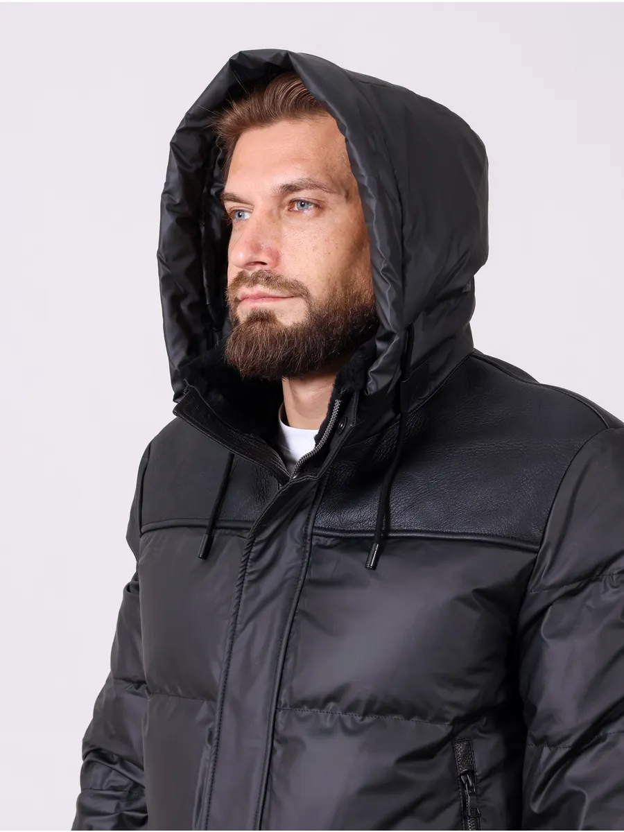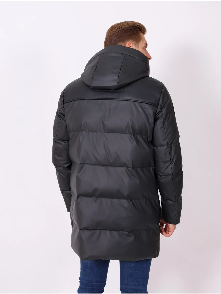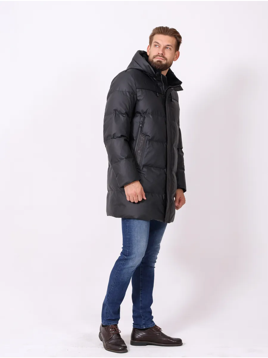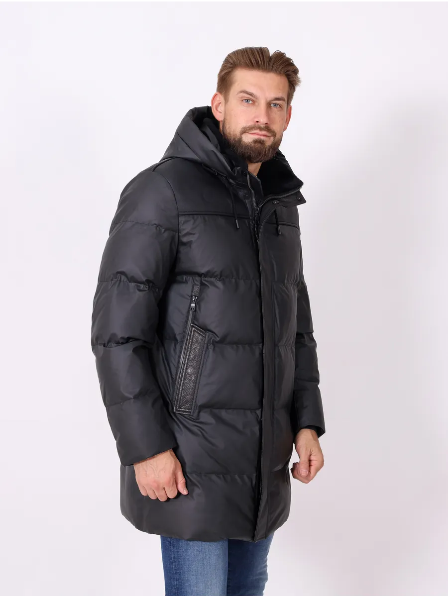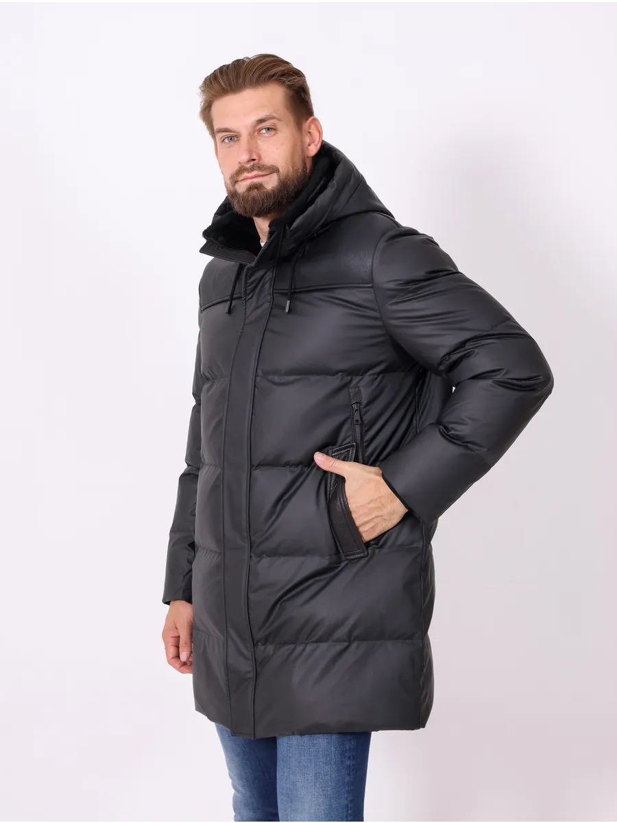 Теплая зимняя мужская куртка станет незаменимым элементом вашего гардероба в холодное время года. Куртка зимняя с капюшоном имеет стеганый дизайн, который обеспечивает равномерное распределение утеплителя, сохраняя тепло и предотвращая образование холодных зон. Стеганая мужская куртка большого размера подходит как для повседневной носки, так и для более формальных случаев. Практичность классической удлиненной куртки с капюшоном подчеркивается наличием теплого меха на воротнике, что делает этот пуховик стильным и необычным. Верхний слой теплого классического зимнего пальто изготовлен из высококачественного материала в составе которого полиэстер и отделка из натуральной кожи. Фурнитура premium черного цвета на карманах и по всей длине. Наполнитель теплой куртки - био пух. Этот материал эффективно удерживает тепло. Люксовая куртка с меховым воротником - тренд зимней коллекции 2025-2026. ОБРАТИТЕ ВНИМАНИЕ! Куртка идеальной длины 90 см. Удлиненный фасон - до колен, надежно защищает от холода и ветра. Убедитесь сами, насколько верхняя мужская одежда может быть практичной и удобной! У нас представлена широкая размерная сетка от 46-58. Каждый мужчина сможет подобрать для себя вариант. Классический черный пуховик прямого кроя - неотъемлемая часть гардероба.