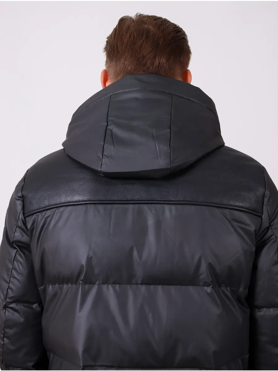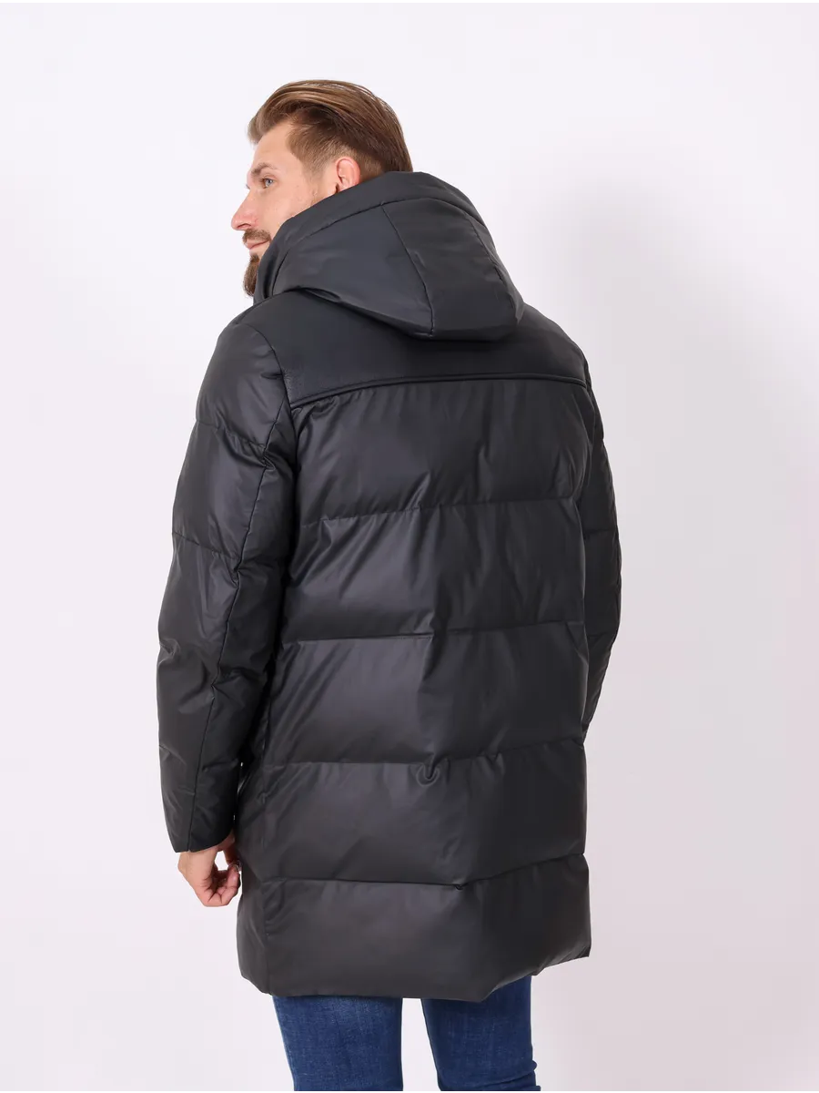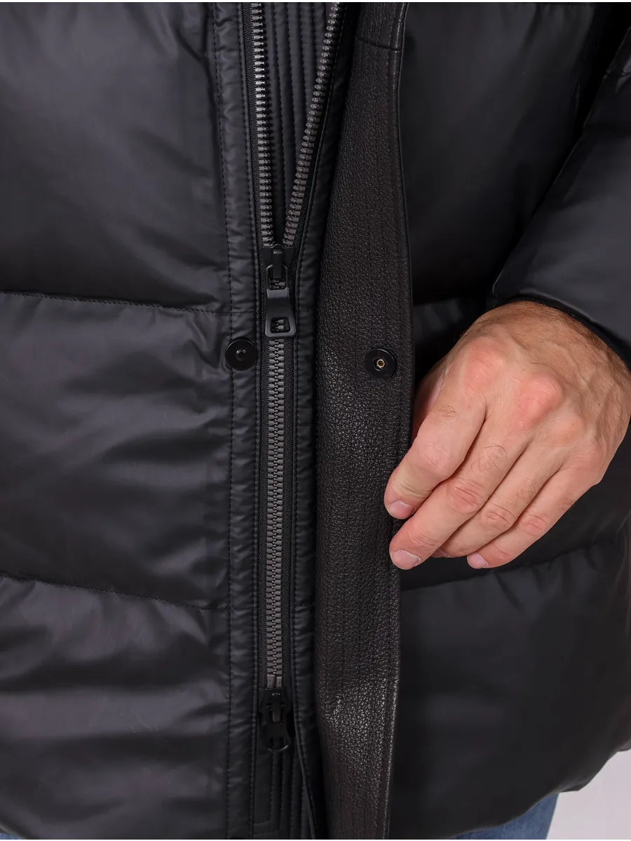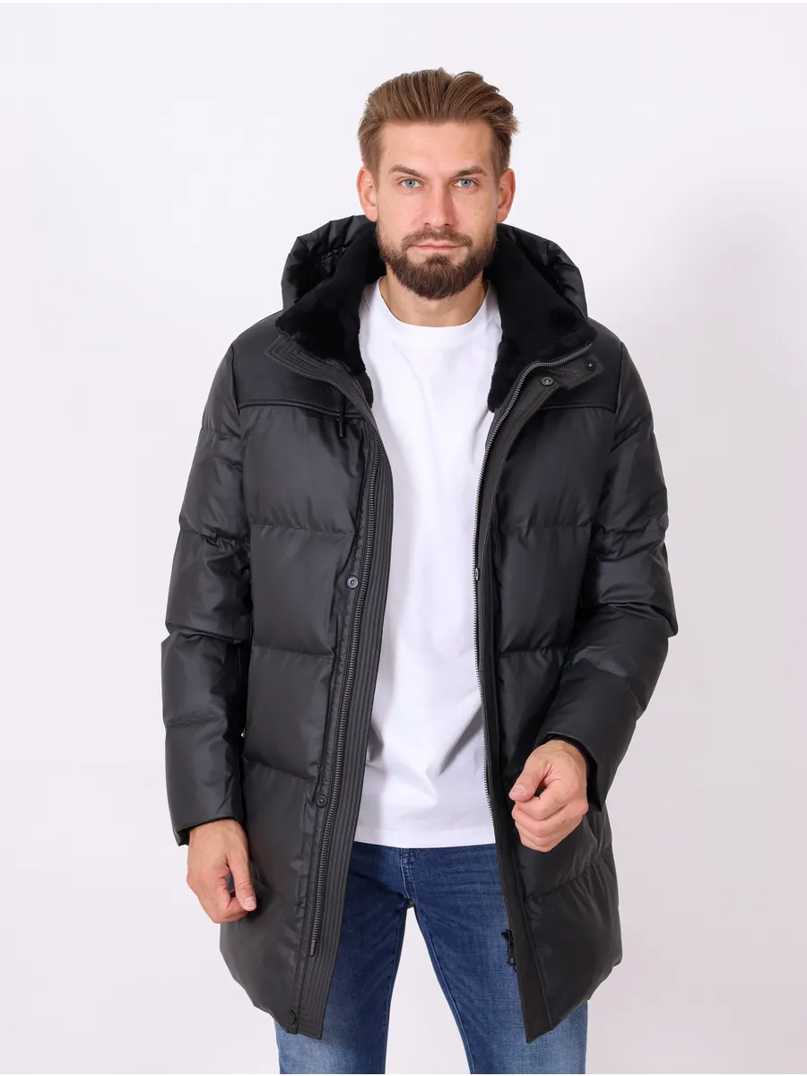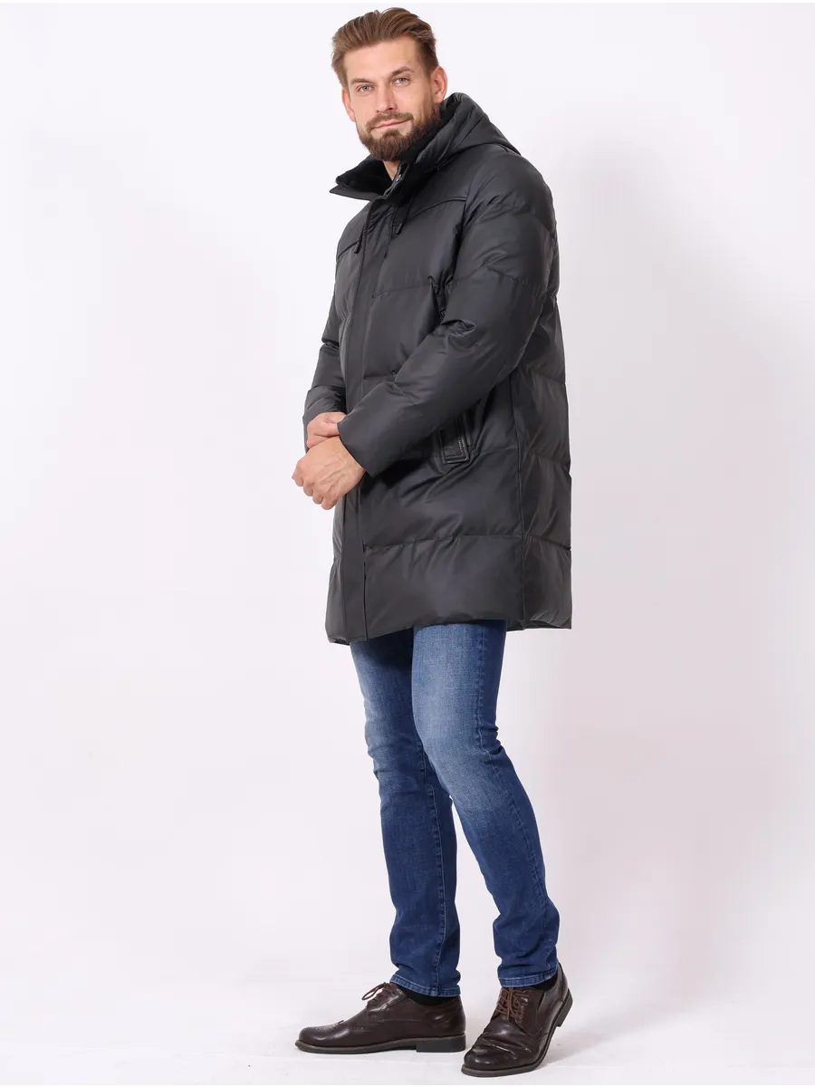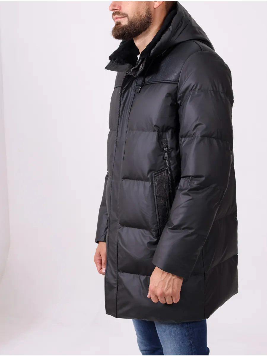 Теплая зимняя мужская куртка станет незаменимым элементом вашего гардероба в холодное время года. Куртка зимняя с капюшоном имеет стеганый дизайн, который обеспечивает равномерное распределение утеплителя, сохраняя тепло и предотвращая образование холодных зон. Стеганая мужская куртка большого размера подходит как для повседневной носки, так и для более формальных случаев. Практичность классической удлиненной куртки с капюшоном подчеркивается наличием теплого меха на воротнике, что делает этот пуховик стильным и необычным. Верхний слой теплого классического зимнего пальто изготовлен из высококачественного материала в составе которого полиэстер и отделка из натуральной кожи. Фурнитура premium черного цвета на карманах и по всей длине. Наполнитель теплой куртки - био пух. Этот материал эффективно удерживает тепло. Люксовая куртка с меховым воротником - тренд зимней коллекции 2025-2026. ОБРАТИТЕ ВНИМАНИЕ! Куртка идеальной длины 90 см. Удлиненный фасон - до колен, надежно защищает от холода и ветра. Убедитесь сами, насколько верхняя мужская одежда может быть практичной и удобной! У нас представлена широкая размерная сетка от 46-58. Каждый мужчина сможет подобрать для себя вариант. Классический черный пуховик прямого кроя - неотъемлемая часть гардероба.