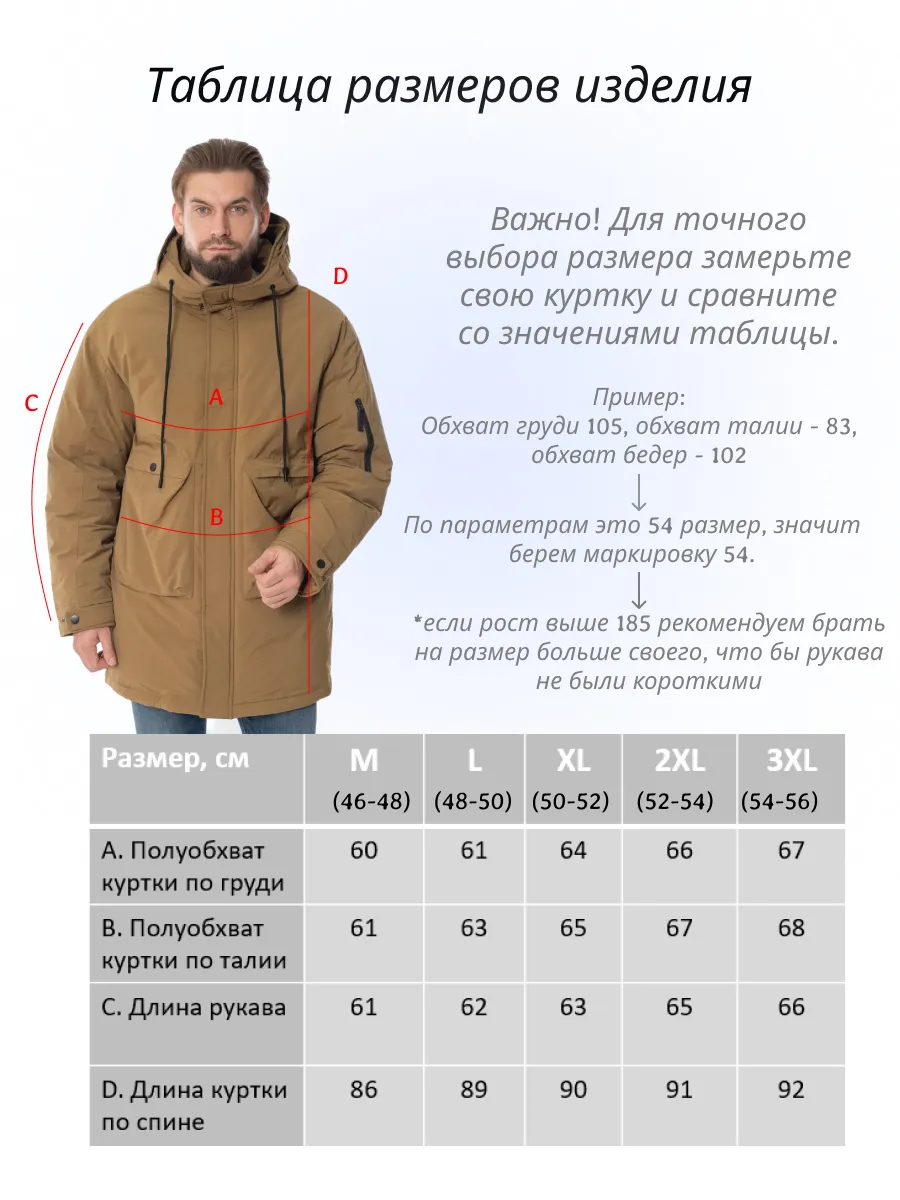 Теплая зимняя мужская куртка парка станет незаменимым элементом вашего гардероба в прохладное время года. Утепленный мужской пуховик имеет молодежный дизайн, который отлично подходит подросткам и парням. Спортивная куртка подходит как для повседневной носки, так и для более формальных случаев. Практичность классической осенне-зимней парки с капюшоном подчеркивается наличием множества карманов: три внешних и два внутренних. Верхний слой теплой осенней ветровки изготовлен из высококачественного материала. Кроме того, ткань верха обладает водоотталкивающими свойствами, что делает удлиненную мужскую куртку идеальным выбором для использования в снежную погоду. Подкладка мужской легкой куртки выполнена из полиэстера. Наполнитель куртки утепленной также выполнен из полиэстера, который обладает отличными теплоизоляционными свойствами. Этот материал эффективно удерживает тепло. Благодаря этому молодежная куртка оверсайз прямого кроя обеспечивает надежную защиту от холода, не стесняя движений и не утяжеляя ваш образ. Съемный капюшон с возможностью регулировки позволяет адаптировать куртку мужскую под различные погодные условия и личные предпочтения. Удлиненная мужская парка с капюшоном оснащена молнией с внутренней ветрозащитной планкой, обеспечивая надежную защиту от холодного воздуха и ветра. У нас представлена широкая размерная сетка от маленьких до больших размеров 46-54, что бы каждый мужчина смог подобрать для себя вариант, эта куртка подходит для высоких и низких мужчин. Мужская верхняя одежда - это отличный подарок для мужчины, студента или подростка. Мы подобрали для вас самые универсальные цвета: классический черный, темный хаки, бежевый, синий.
